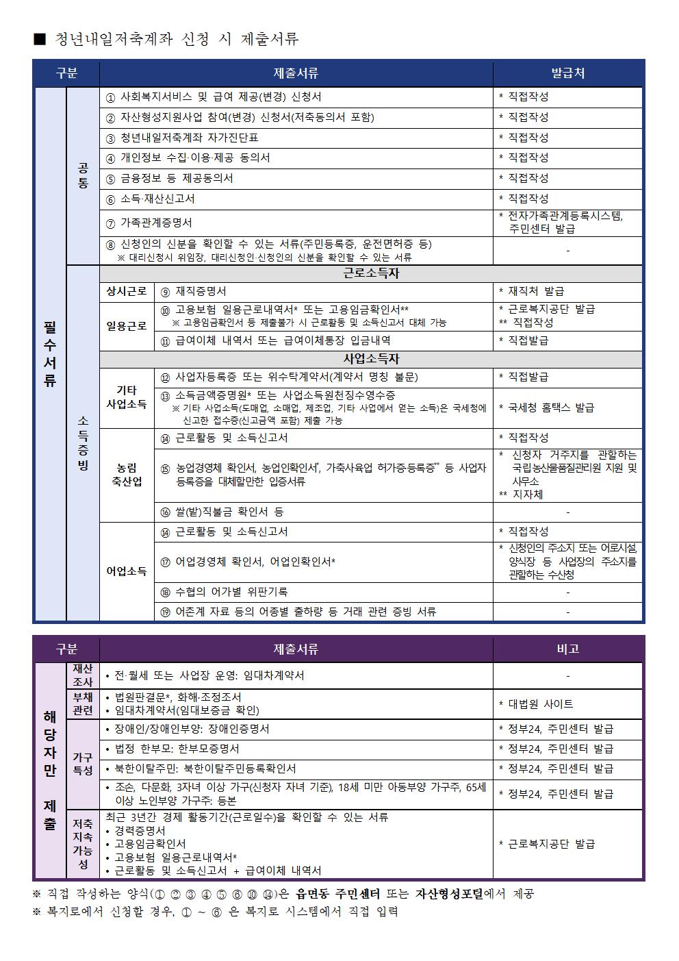 청년내일저축계좌 신청 대상자인 분들은 제출 서류를 확인하셔서 누락 및 실수 없이 한번에 신청하시기 바랍니다. 공통으로 필요한 사회복지서비스 및 급여 제공 신청서, 자산형성지원사업 참여 신청서, 청년내일저축계좌 자가진단표, 개인정보 수집 이용 제공 동의서, 금융정보 등 제공 동의서, 소득 재산 신고서, 가족관계증명서, 신청인의 신분을 확인할 있는 서류 등을 미리 준비하시면 신청 시 도움이 됩니다. 그 외 준비해야 할 서류는 아래 그림을 참조해 주시면 됩니다. 신청 서류는 이미지 파일 하단에 첨부했습니다.
